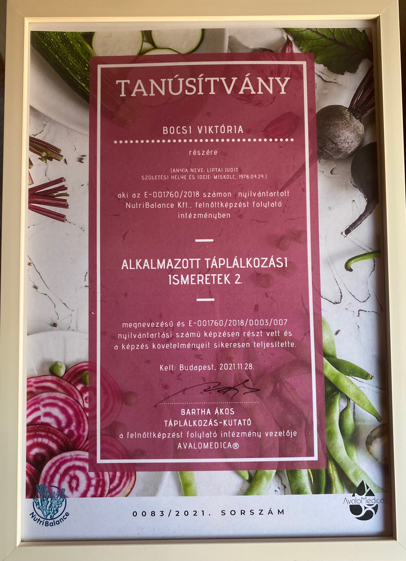 Ez a tanúsítvány igazolja, hogy részt vettem az Alkalmazott Táplálkozási Ismeretek 2 képzésen, és sikeresen teljesítettem a képzés követelményeit.